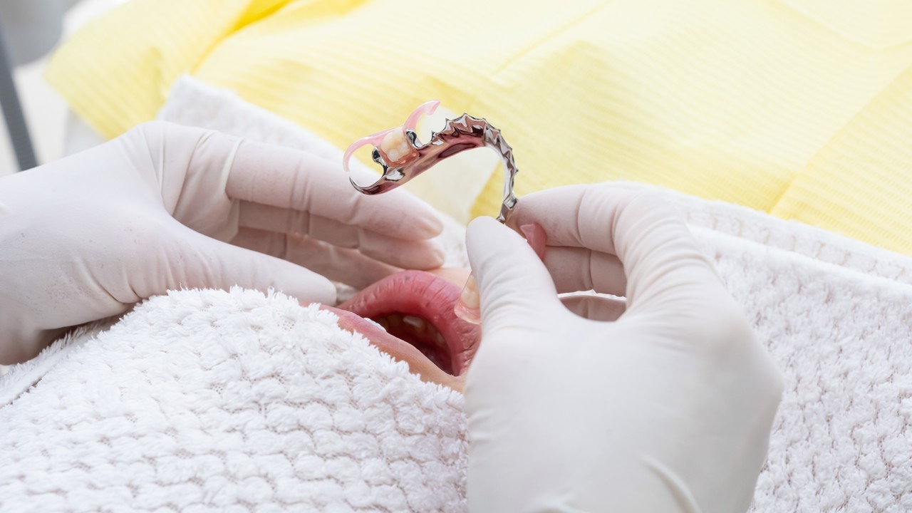 治療の説明:金属のクラスプ(入れ歯の留め具)を使用しない部分入れ歯です。入れ歯と気づかれにくく、自然な見た目を実現できます。弾性のある素材で、残った歯への負担も少ないのが特徴です。