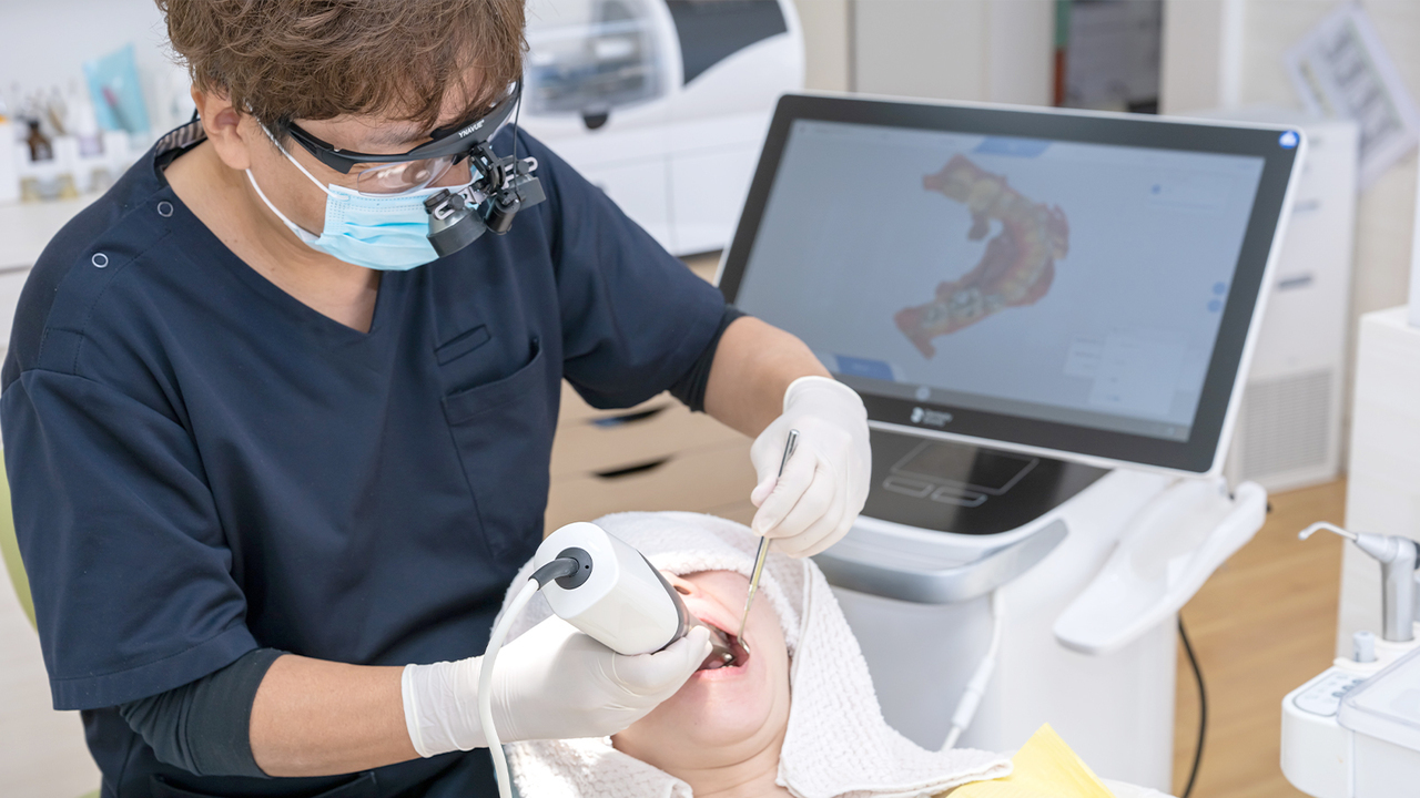 当院は、最新機器「口腔内スキャナー」を導入しています。口腔内スキャナーとは、専用カメラでお口の中をスキャンするだけで型どりができる機器です。取得した画像はコンピューター上で解析します。